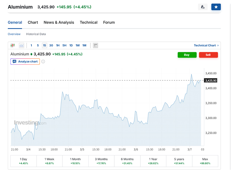 According to a recent news report from Mining.com.au, the aluminum spot price went over US$3,333 per ton in early March. The news report explains two main reasons for this: